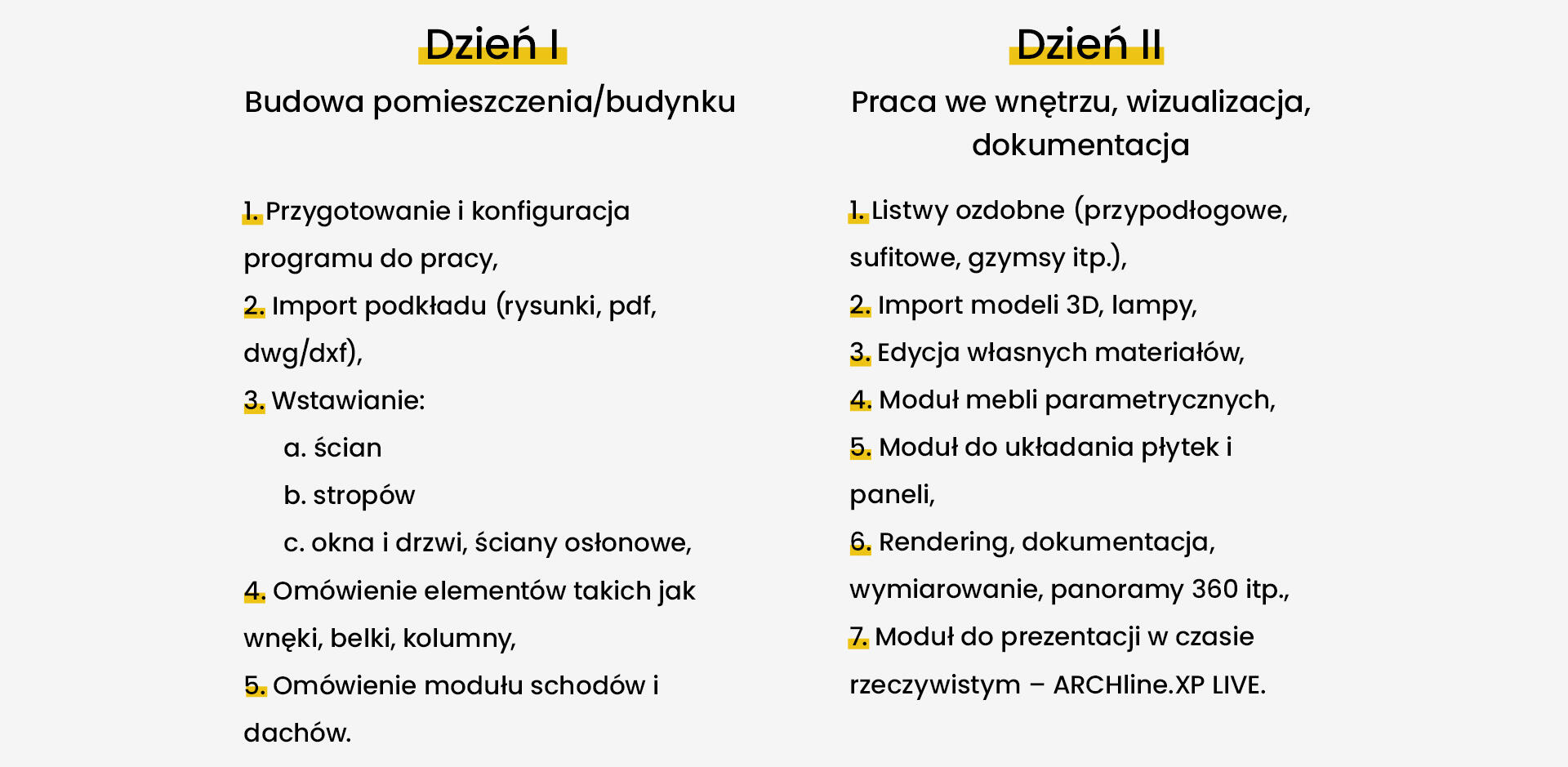 Praktyczne zagadnienia – Na szkoleniu zostaną omówione praktyczne zagadnienia dotyczące budowy pomieszczeń i budynków oraz praca projektanta we wnętrzu, w tym tworzenie wizualizacji i generowanie kompleksowej dokumentacji.Atrakcyjna cena – Regularny koszt szkolenia to 1200 zł! Obecna promocyjna cena 99 zł obejmuje pełnowartościowe szkolenie, materiały dodatkowe oraz wyżywienie dla wszystkich uczestników.Kameralne grupy – W związku z warsztatową formą szkolenia przewidujemy kameralne grupy, maksymalnie 8-10 uczestników.Upominki – każdy uczestnik szkolenia otrzyma podręcznik oraz voucher uprawniający do 10% zniżki na zakup oprogramowania ARCHLine.XP.